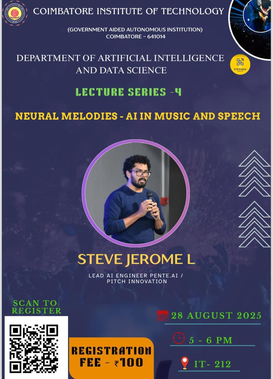 We’re glad to welcome Steve Jerome L, Lead AI Engineer at PENTE.AI / Pitch Innovation. He has experience in building AI models for creative applications and will share valuable insights to inspire students, faculty, and professionals.