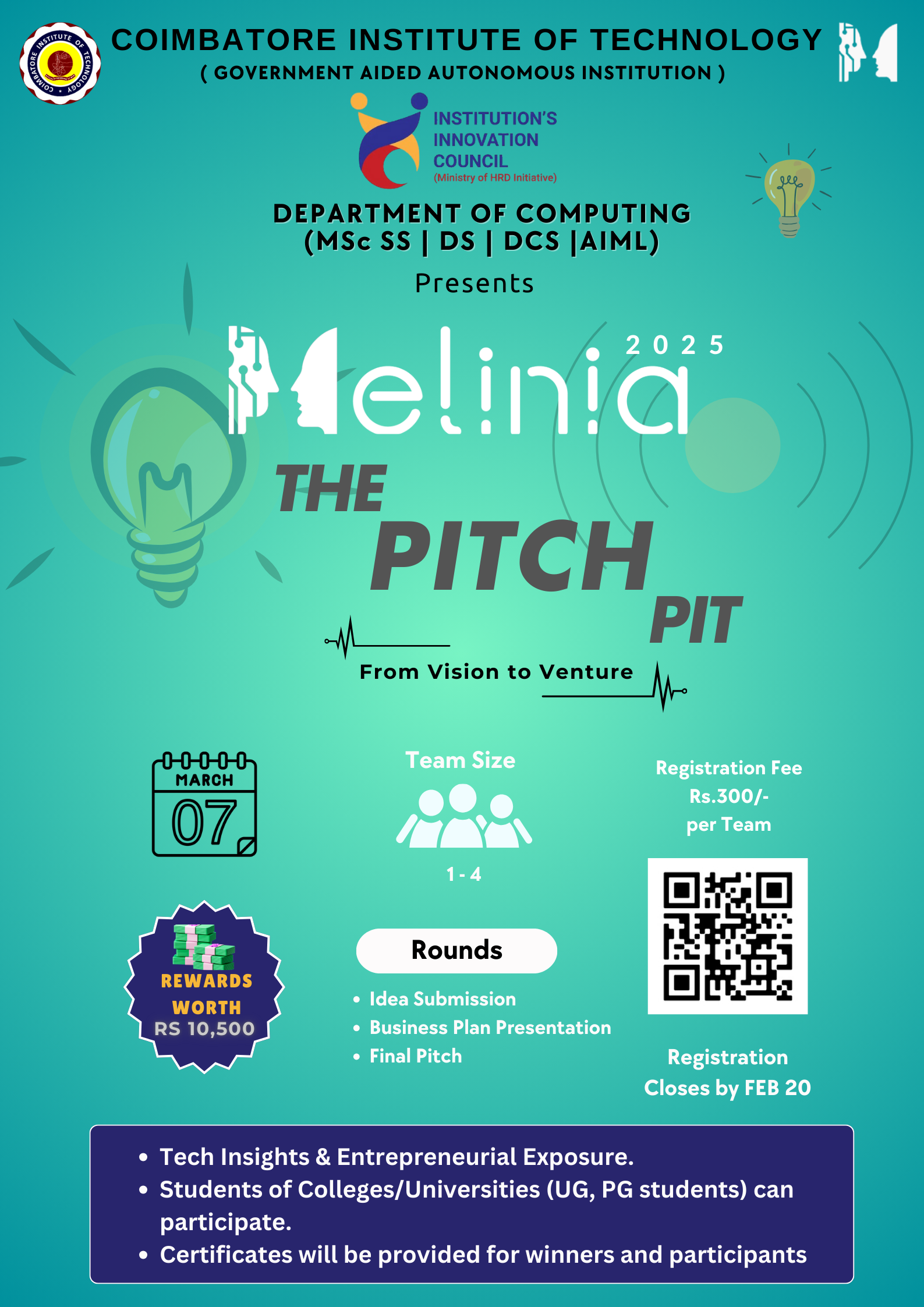 - Round 3: Final Pitch (Offline) Date: March 7, 2025 Venue: Coimbatore Institute of Technology