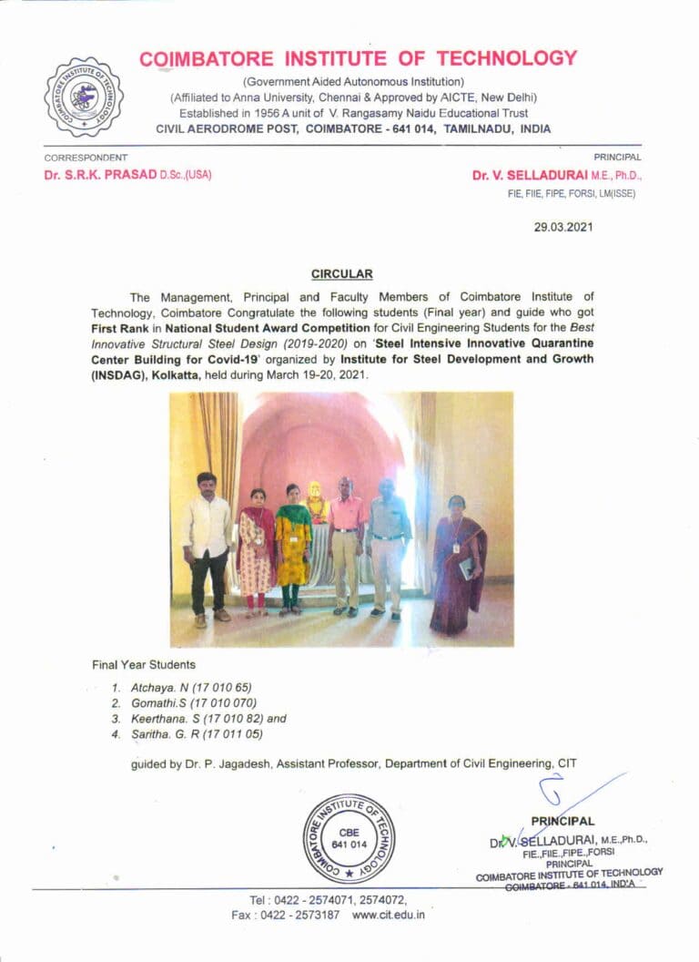 V.PJANANIE, C.KIRUTHIKA, R.SHIVANI & D.K.SUBASHINI batch of 2020 Passed out secured 2B at Design Competition conducted by INSDAG held at Kolkata.
