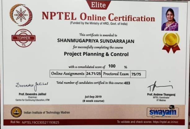 Dr.S.Shanmuga Priya, Topper of 1% in course “Project Planning & Control conducted by NPTEL