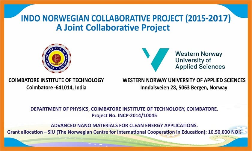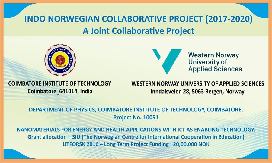 The department has a well-established laboratory to prepare thin films and nanomaterials by physical and chemical methods. Departmental laboratory is equipped with sophisticated instruments like, atomic force microscope, spectrophotometer, Raman Spectrometer, Hall effect measurement system and photoluminescence arrangement. The department has received funds more than Rs. 3 Crore from different government funding agencies like DST, UGC, CSIR, AICTE and also from international funding agencies.Coimbatore Institute of Technology and Western Norway University of Applied Sciences (HVL)(previously known as Bergen University College) started joint academic and research collaboration activities in the year 2010 and the first MoU between the two institutions was signed in the year 2011.